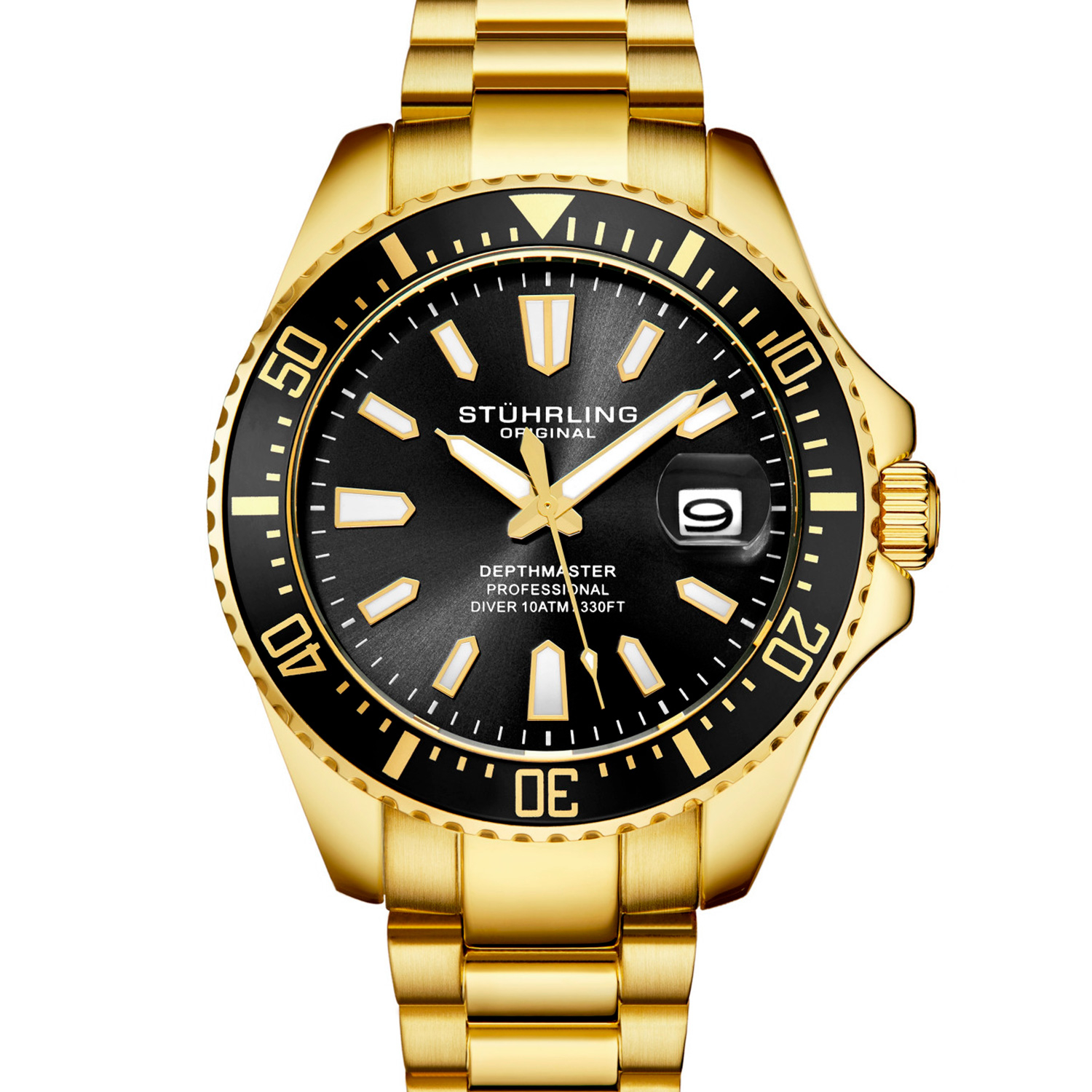 Med dette ur fra Stührling får du et moderne herreur med lænke i guld udført i hårdført og langtidsholdbart rustfrit stål og med sort urskive. Uret er designet i et dykker look, hvor du i urkransen har tachymeter i sort, som giver et moderne udtryk. Uret er vandtæt til 10 ATM, som svarer til et tryk på 100 meter. Uret har monteret højkvalitets safirglas, som er det dyreste og bedste glas et ur kan have. Safirglas er først og fremmest ridsefrit, hvilket i praktisk betyder at glasset ikke kan ridses – derudover er det også det hårdeste glas, der findes til ure.