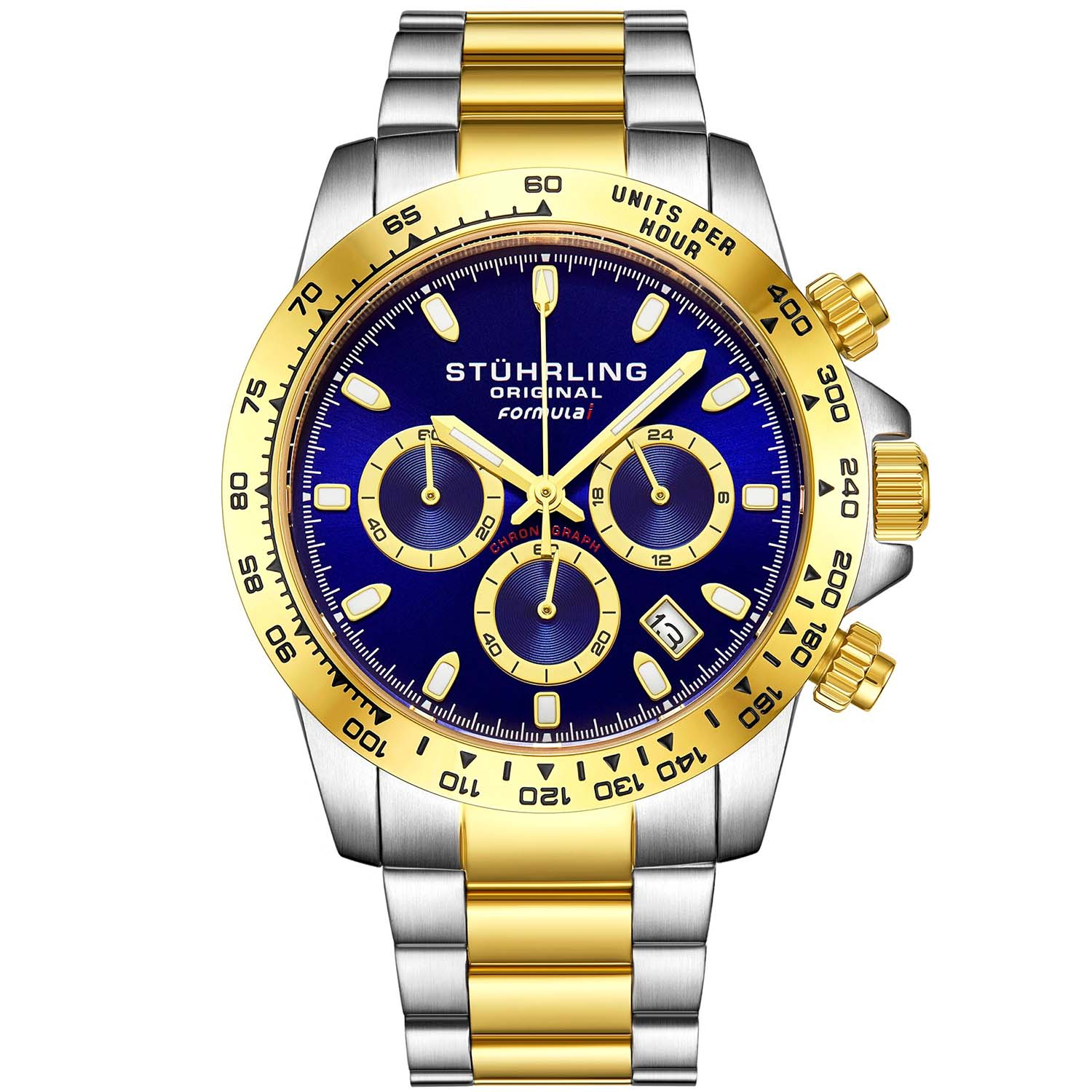 Med dette ur fra Stührling får du et moderne herreur med lænke udført i hårdført og langtidsholdbart rustfrit stål og med en flot mørkeblå urskive. Urkransen er udsmykket med et tachymeter, og lænken er bestående af en blanding af guld og stål, hvilket giver uret et ekslusivt look. Uret er vandtæt til 10 ATM, som svarer til et tryk på 100 meter. Glasset på dette ur er brudsikkert mineralglas, som er hårdere end almindeligt glas på grund af behandlingen. Det har derfor sværere ved at splintre, hvis der skulle opstå en skade.